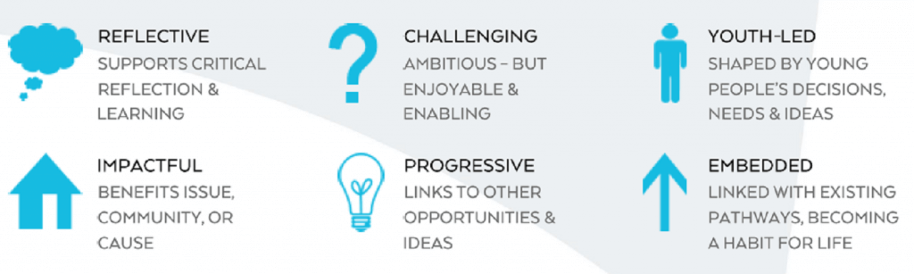 Six principles of social action – Projects must demonstrate how they will apply all six principles of youth social action: